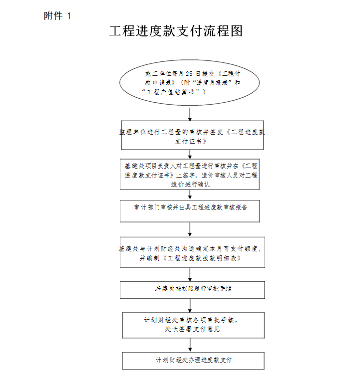 (七)基建处将付款审批材料送交计划财经处。计划财经处对各项审批手续审核无误后,由处长签署支付意见;
