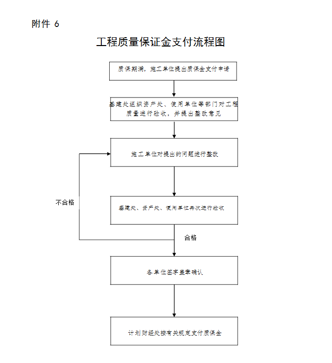 (六)基建处将付款审批材料送交计划财经处,计划财经处审核无误后,由处长签署支付意见。基建处通知施工单位本次付款核定金额,施工单位持付款手续到计划财经处取款;