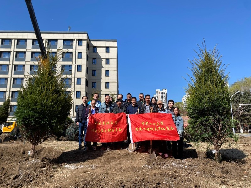 植树现场,红旗飘扬,教职工党员和研究生党员一起挖坑、填土、浇水,相互协作、配合默契。经过半天的劳作,40棵红豆杉迎风挺立,在南湖校区2号学生宿舍东侧形成了一片靓丽的景观。