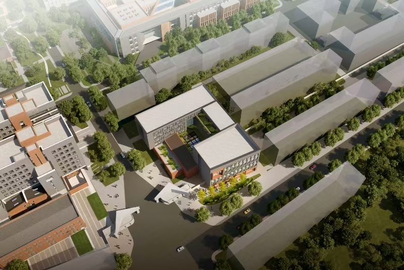 综合实验楼四期项目拟建位置位于南湖校区南门附近,东邻学生第五宿舍,西侧为深部智能开采过程控制实验中心,南面毗邻文体西路,北面接临建房。项目用地现为印刷厂仓库、印刷厂纸库、印刷厂厂办,拆除并在原址新建综合实验楼,总建筑面积约19980平方米。